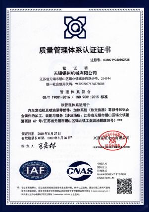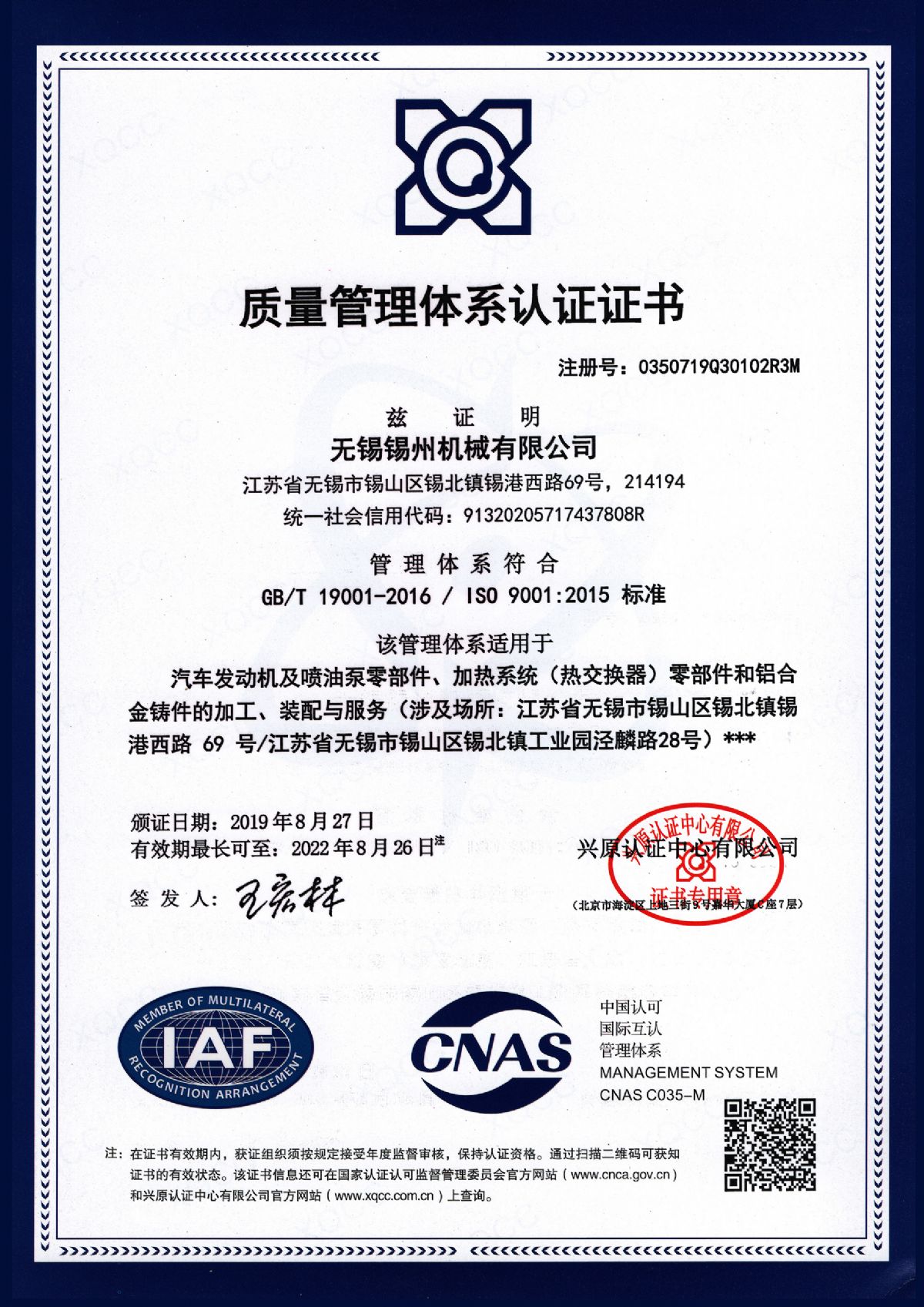 “ 以質(zhì)量求生存,以管理增效益”是錫州機(jī)械堅(jiān)定不渝的經(jīng)營(yíng)理念;“質(zhì)量第一、客戶至上”是錫州機(jī)械堅(jiān)持不懈的追求;“ 以人為本,鑄就優(yōu)質(zhì)產(chǎn)品, 精益求精,增強(qiáng)顧客滿意”是錫州機(jī)械持之以恒的質(zhì)量方針。 2001年7月公司通過(guò)ISO9001:2000質(zhì)量體系認(rèn)證, 2005年9月通過(guò)ISO/TS16949質(zhì)量體系認(rèn)證。公司于2007年7月通過(guò)產(chǎn)品ASME認(rèn)證。 通過(guò)開展以產(chǎn)品質(zhì)量為中心的企業(yè)管理,公司以先進(jìn)的生產(chǎn)檢測(cè)設(shè)備、完善的質(zhì)量保證體系、嚴(yán)密的產(chǎn)品開發(fā)體系、嚴(yán)格按照標(biāo)準(zhǔn)開展產(chǎn)品生產(chǎn)管理,并開展6S現(xiàn)場(chǎng)管理,竭盡全力創(chuàng)造一個(gè)比較清潔、健康、安全的環(huán)境,全方位地滿足國(guó)內(nèi)外客戶的要求。